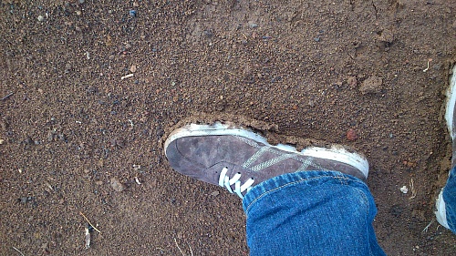 А теперь вопрос! Нахрена ходить по мокрой трассе? Там хоть затрамбуйся после ноги будет след.